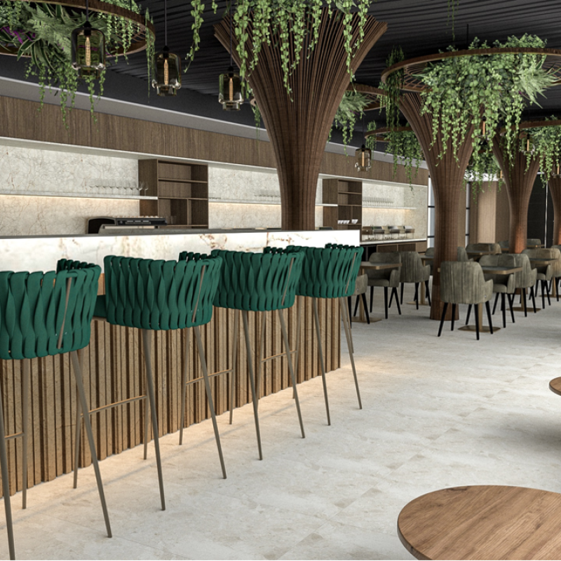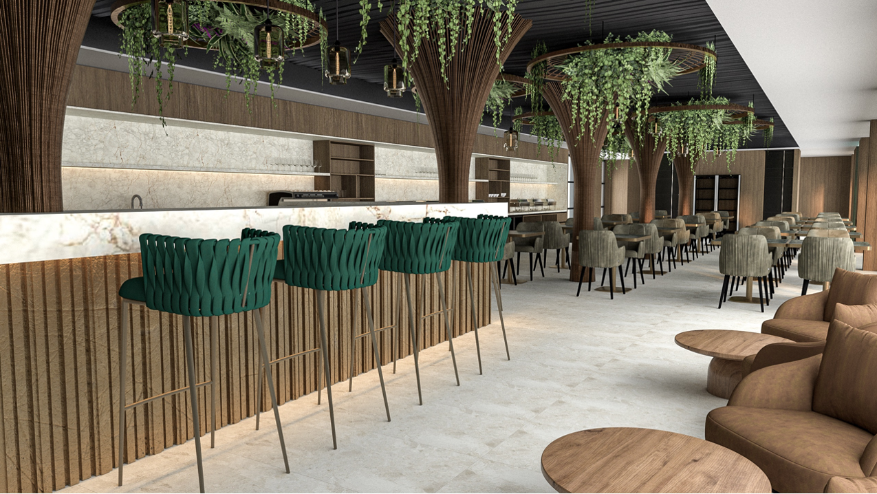 V této zakázce jsme si pohráli se zajímavými povrchy a světlem. K matnému obložení baru je zvolen lesklý povrch stěny, který se mění v závislosti na dopadajícím světle a vytváří měnící se hru světel a odrazů. V části s posezením byly zvoleny přírodní materiály a tóny a tak tyto dvě části jednoho prostoru kontrastují a zároveň jsou v jakési symbióze.